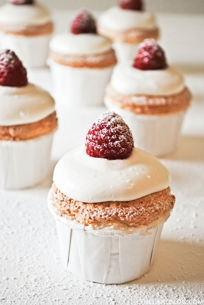 These angel food cupcakes may seem simple, but once you decorate them with white frosting and powdered sugar dusted raspberries, they turn into the prettiest winter cupcakes ever. Create a cupcake tower out of them, or serve them at your dessert table.