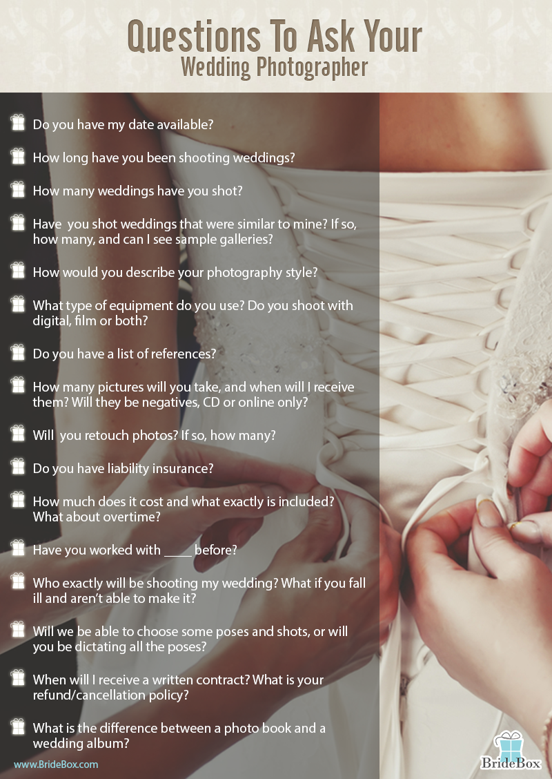 Your wedding photographer is perhaps the most important vendor you’ll have to select for your wedding day. S/he will be the person documenting all of the raw emotions, special moments and little details of the most important day of your life. To help you find the right wedding photographer, we’ve put together a list of questions that you should ask them to ensure that you’ll be a good match.