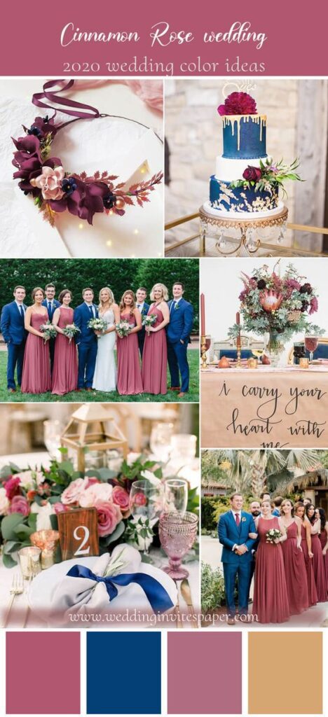 Cinnamon rose and dusty rose have becoming increasingly popular over the years. They are ideal colors to use if you’re planning a modern, formal affair that is going to add a unique mix of colors to your growing love. To balance out the darker tones, use a creamy or smoky taupe color to lighten up the theme and create a beautiful contrast in colors. This combination of cinnamon rose and dusty rose is ideal for summer weddings, though the colors would look great year round.