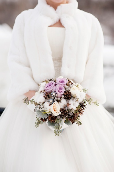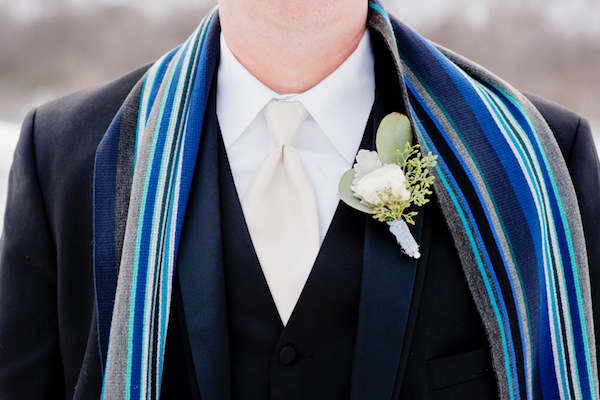 After their lovely ceremony, the couple heads out to capture some beautiful shots. Stacy puts on an elegant white coat and warm winter boots. Jason stays warm with a nice blue-striped scarf. It had snowed the day before, so the ground is covered by a fresh coat of powder snow, making for beautiful outdoor wedding photos. It is a true winter wonderland.