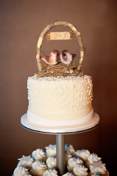 The bridal party and the happy couple then head to St. Elias Centre where the reception is held. The wedding guests get together for a nice meal, good music and joyful celebration. The wedding cake is paired with winter-white cupcakes. On top of the the beautiful cake, two lovebirds are perched, standing side-by-side on a nest. Excitement and joy fill the room.