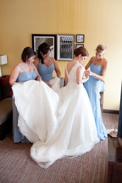 Before donning their elegant baby blue dresses, the bridesmaids take turns having their hair and makeup done. Once she is also ready, they help Stacy into her gorgeous wedding dress before heading to St. George’s Parish Church for the ceremony. With her bouquet in hand and father by her side, she heads down the alley toward her smiling spouse-to-be.