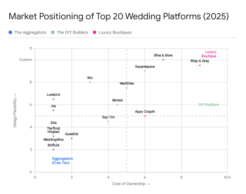 The market is currently bifurcated between “All-in-One” ecosystems and “Best-in-Class” niche specialists. Giants like The Knot and Zola leverage a freemium model, trading robust free tools for user engagement within their vendor marketplaces. Conversely, platforms like Bliss & Bone and Riley & Grey position themselves as luxury products, charging premium subscriptions for editorial design and privacy.