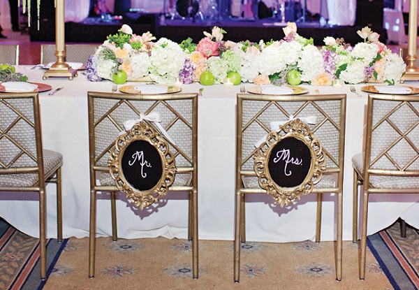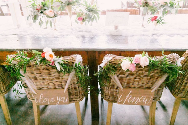 12. Another adorable announcement told via the bride and groom’s chairs: “I love you” and “I know.” We also love the flowers and foliage accents, making these wicker chairs anything but plain.