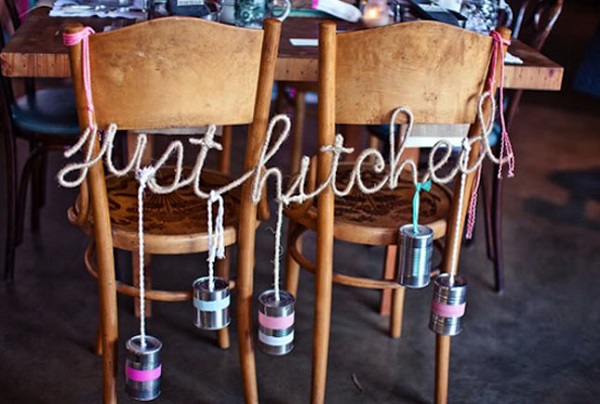 9. Rope spelling out “Just Hitched” along with tin cans tied to simple wooden chairs are ideal for any rustic wedding.