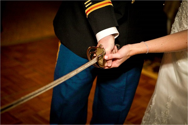 One of the most common military wedding traditions is the saber arch, or arch of swords. Sabers are curved, single-edged swords and are wielded by the ushers in the bridal party. Typically there are six to eight saber bearers in order to create this arch. The swords are raised to create an arch and walkway for the bride and groom to walk through, and the time at which this is done during the ceremony depends on the branch of military.