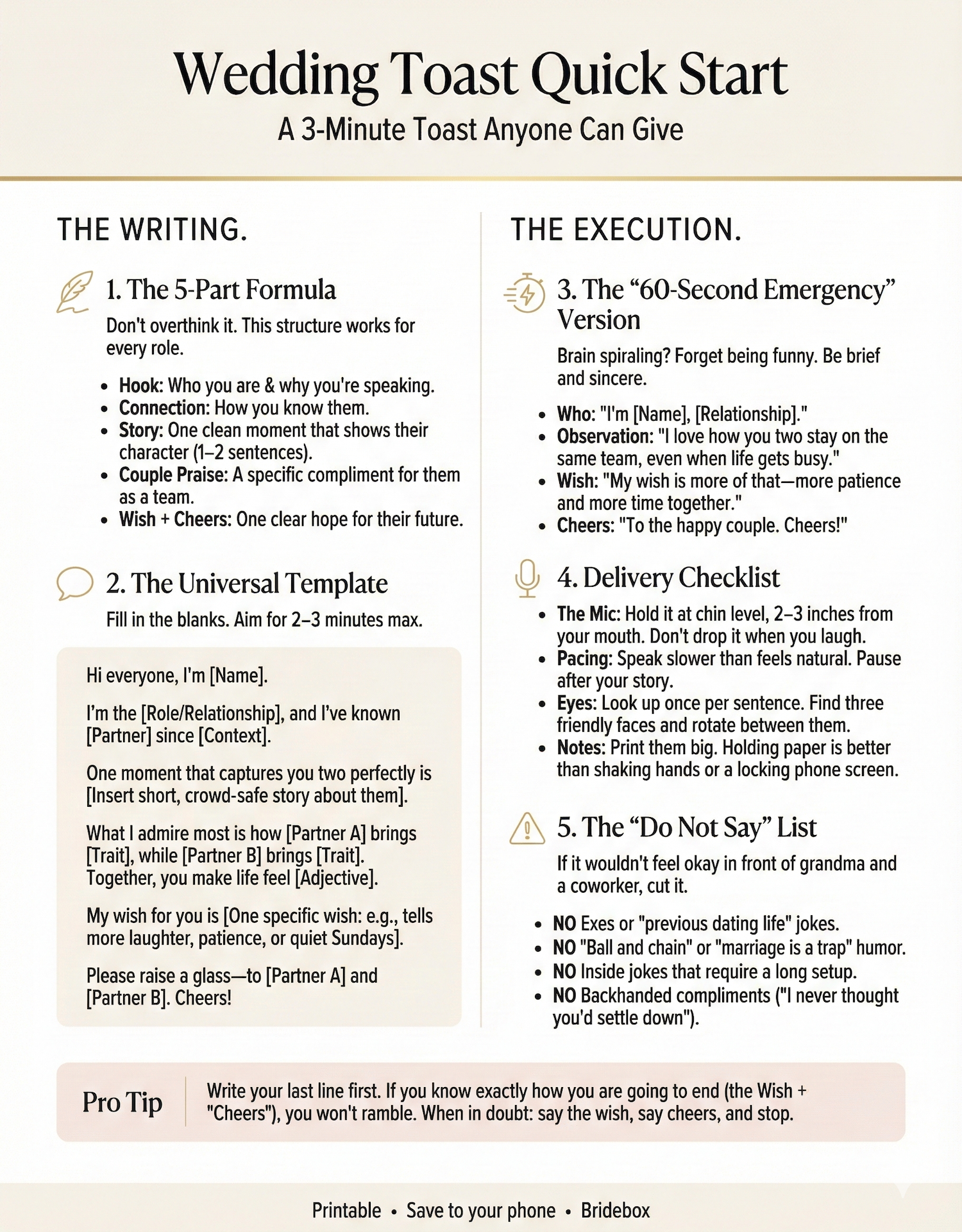 - Pick one structure: 60-second toast or 2-minute toast.