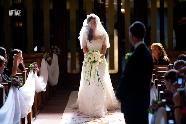 Your dress and bouquet may be heavy, and you might not be used to wearing your wedding heels, but the easiest way to instantly appear more graceful and elegant is to stand up straight. Having good posture while you walk down the aisle will make you look tall, lean and more beautiful. Hunching over will look especially obvious in photos, and something as simple as rolling your shoulders down your back will you help you avoid this unappealing look.