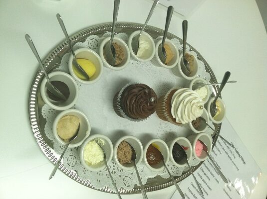 Before Sean and I had reached a decision on which design we liked, our cake consultant returned, balancing a silver oval-shaped tray, topped with tons of little ceramic cups and two cupcakes. One cupcake was chocolate with a glittery chocolate icing, and the other was the yellow cake with butter cream icing flecked with multi-colored sprinkles. Neither of us is a fan of chocolate cake, so the yellow cake one served as our default during the tasting. Our cake consultant handed us a laminated sheet of paper. The sheet had the names of all of the cake filling flavors; written in the order they appeared on the tray. She recommended that we take pieces of the cupcake and make sure that we taste it with both the icing and some of the filling. It was kind of difficult to maneuver that with a cupcake, but somehow we managed.