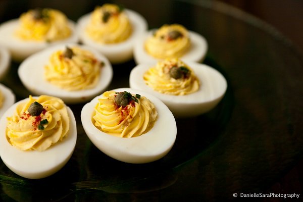 There are many ways to choose what your reception food will be. You might pick some popular favorites, you may prefer some of your personal favorites, or you might choose your reception food to match the season. Eggs are traditionally a breakfast food, making deviled eggs an especially great fit for day-time weddings any season of the year. But if your wedding is in the evening, don’t be too quick to rule it out; this finger food is a popular classic that guests of all ages can enjoy. You can keep it simple, or add bacon or olives for an unexpected touch!