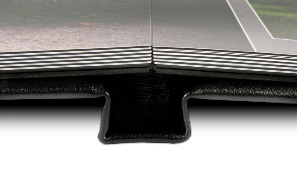 4. Covers – the above albums come typically with either a photo cover or a true leather cover. Because of the nature of the album binding there is no “book block” that is tucked into the cover’s “gutter” and thus pages fully lay flat. These albums typically (if created by a professional, or when using BrideBox album design software) deliver full panoramic and lay flat pages.