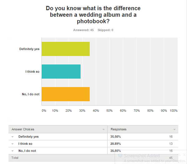 Update 12/4/2014: Before we dive into the differences between the two, we have just conducted a recent survey about wedding albums. One question we asked our brides was “do you know the difference between a wedding album & photo book” Here are the results: